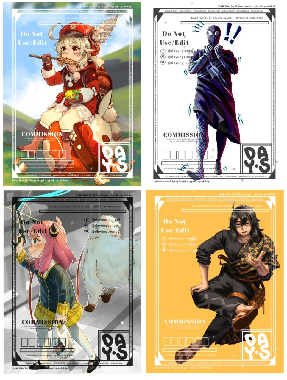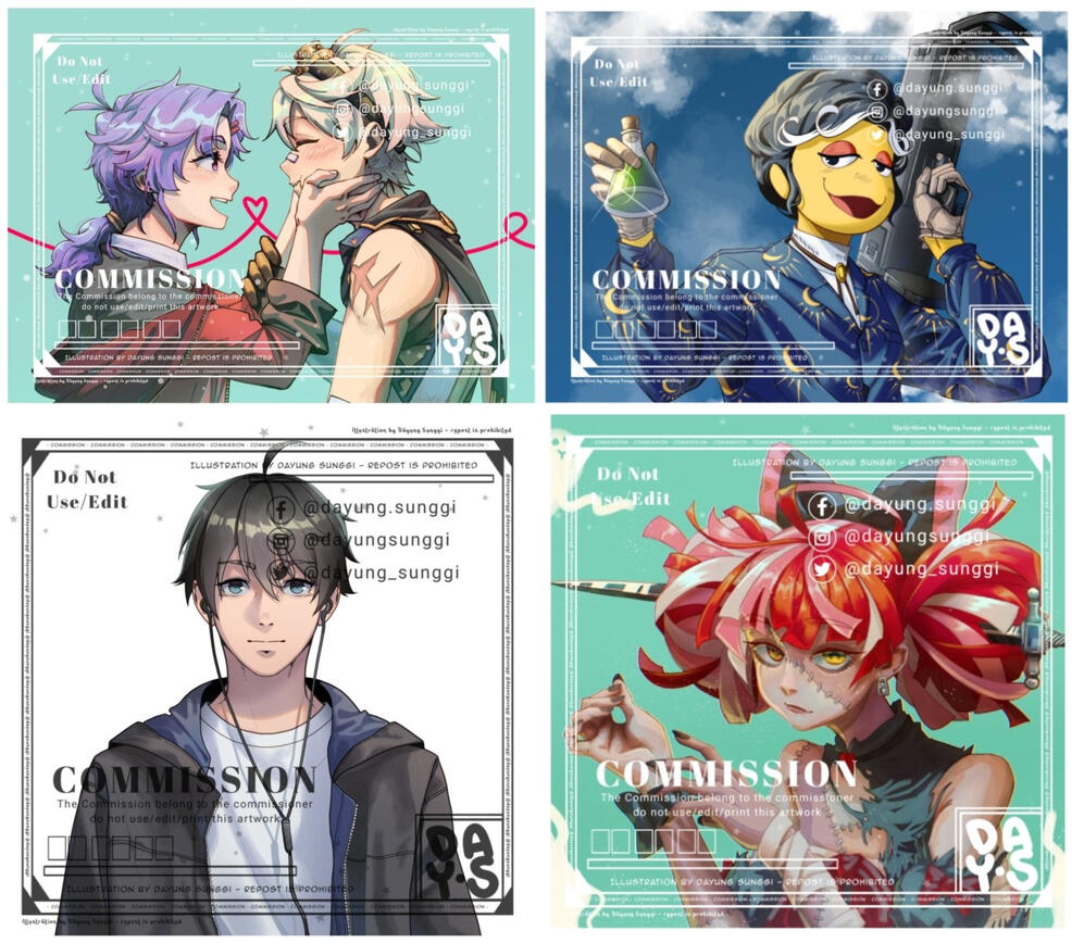 (@dayungsunggi)• Type of commission : (bust up / waist up / fullbody)• Provide me name to put on the list• Reference : (your character visual, details and their personality, Please send me the clear reference of the character as detail as possible,so I won’t draw them out of character)• Important info : (specific pose, expression, and color pallete)• Background : (please tell me if you want a specific background)