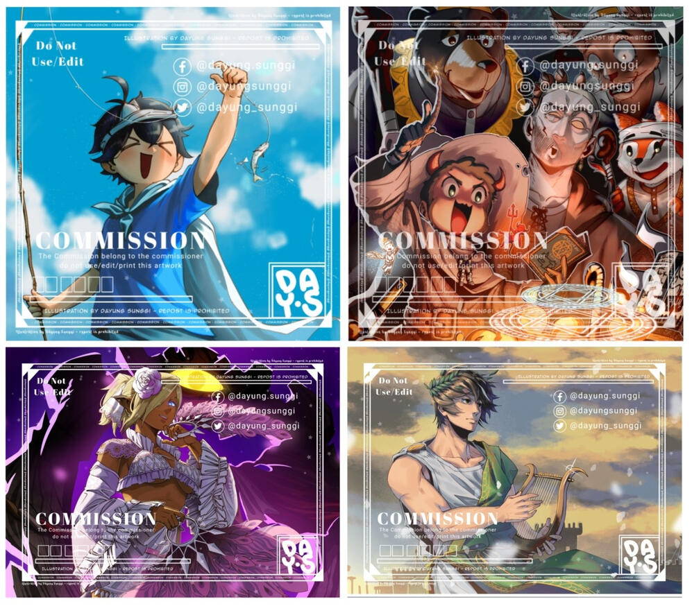 • Personal Use Only. For commercial work, please contact me to discuss further.• All the price is the base price, the price may changes depending on complexity of your request.• All payment via local bank (BCA), and digital wallet DANA.• Full payment after the sketch is done• Simple background (solid/color pattern/gradient) are FREE• Max 4 characters in 1 canvas.• Revision max 3x, more than that there will be extra cost.• I am allowed to post the commission piece with watermarks to my social media for my portfolio,please tell me if you don't want the commission result to be posted.• I have the right to refuse the commission, if there have things I'm not comfortable or I can not do with my ability.• No deadline and no rushing (it takes 7-10 days to finish 1 slot)• No cancel after i begin the commission process.• The cancelation from me will be fully refund.